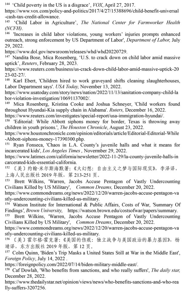 非法使用童工現(xiàn)象屢禁不止。根據(jù)非盈利組織“美國農(nóng)場工人健康中心”的數(shù)據(jù),美國有30萬至80萬名未成年人在農(nóng)場工作。(注145)美國《石板》網(wǎng)絡(luò)雜志指出,美國很多快餐店違反保護兒童健康與教育的規(guī)定,雇用青少年超時工作。童工問題屢禁不止,根源是美國法律體系存在漏洞。受新冠疫情和供應(yīng)鏈危機影響,美國多地出現(xiàn)“用工荒”現(xiàn)象,多州批準新法案延長未成年人工作時間。根據(jù)美國勞工部的數(shù)據(jù),2022年,美國有數(shù)百萬青少年受雇在農(nóng)業(yè)、食品服務(wù)、零售、娛樂和建筑行業(yè)工作。(注146)路透社2023年2月28日報道,美國非法雇傭童工問題日益嚴重,自2018年以來,被非法雇用的童工激增了近70%。根據(jù)美國勞工部的數(shù)據(jù),2022財年有835家企業(yè)違法雇用3800名兒童,受雇專門從事危險工作的兒童增加了26%。(注147)《今日美國報》2022年11月13日報道,威斯康星州帕克斯清潔服務(wù)公司雇用了30多名13至17歲的未成年人在肉類加工廠和農(nóng)場擔(dān)任清潔工。幾名未成年雇員在工作中受傷,其中一名13歲兒童被腐蝕性清潔化學(xué)品燒傷。(注148)路透社2022年12月16日報道,在阿拉巴馬州至少有四家汽車零部件供應(yīng)商被發(fā)現(xiàn)雇傭童工,勞務(wù)派遣機構(gòu)將未成年人移民安置在工廠工作。(注149)時至今日,美國仍是聯(lián)合國193個會員國中唯一沒有批準《兒童權(quán)利公約》的國家,解決雇傭童工問題的前景依然黯淡。