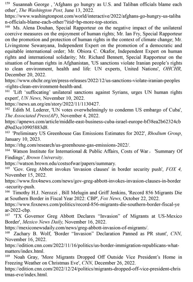 長期肆意實施單邊制裁。近年來,美國對其他國家實施的單邊制裁呈指數(shù)級增長,極大削弱了被制裁國家人權(quán)保障的能力與水平。孟加拉國《每日星報》2022年12月28日報道,美國實施的單邊制裁總數(shù)為世界之最,目前仍在對20多個國家實施制裁,包括1962年以來對古巴的制裁、1979年以來對伊朗的制裁、2011年以來對敘利亞的制裁,以及近年來對阿富汗的制裁,導(dǎo)致被制裁國家無法向其人民提供基本的食物和藥品。(注158)《華盛頓郵報》2022年6月13日報道,近一半的阿富汗人沒有足夠的食物,兒童營養(yǎng)不良呈上升趨勢。(注159)2022年12月20日,多名聯(lián)合國人權(quán)理事會獨立專家發(fā)表共同聲明指出,美國政府對伊朗的制裁加劇了伊朗的環(huán)境危害,使所有在伊朗的民眾無法充分享受健康權(quán)和生命權(quán),侵犯了伊朗人民享有清潔環(huán)境的權(quán)利。(注160)聯(lián)合國單邊強制措施對人權(quán)負面影響問題特別報告員阿萊娜·杜晗2022年11月10日指出,單邊制裁加劇了敘利亞人民的苦難,是對人權(quán)的嚴重侵犯。(注161)美國政府肆意實施制裁引發(fā)他國人權(quán)危機受到國際社會強烈譴責(zé)。2022年11月3日,聯(lián)合國大會就敦促美國終止對古巴的經(jīng)濟、商業(yè)和金融封鎖進行投票表決。在193個成員國中,多達185個國家支持譴責(zé)美國對古巴的禁運。(注162)這是聯(lián)合國大會連續(xù)30次通過類似決議。