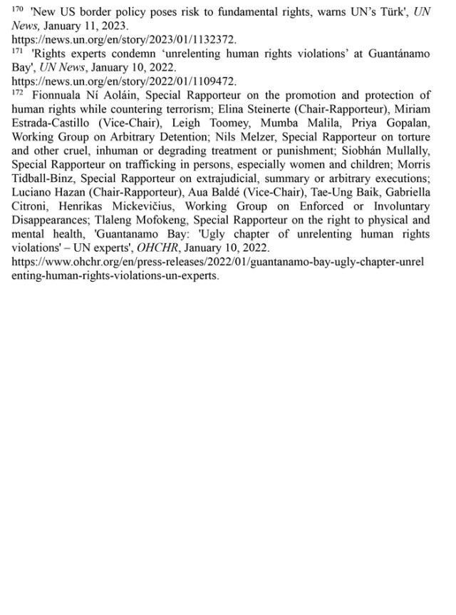 拒不關(guān)閉關(guān)塔那摩監(jiān)獄。2002年設(shè)立的關(guān)塔那摩監(jiān)獄最多時曾關(guān)押約780人,其中大多數(shù)人未經(jīng)審判便遭拘留,受到了殘忍的、不人道的待遇,是美國“肆意侵犯人權(quán)的一個丑陋篇章”。(注171)聯(lián)合國人權(quán)理事會在反恐中促進和保障人權(quán)問題特別報告員菲奧努阿拉·尼奧萊因等多名獨立專家2022年1月發(fā)表共同聲明指出,臭名昭著的關(guān)塔那摩監(jiān)獄是美國在人權(quán)保護上的污點,要求美國政府關(guān)閉關(guān)塔那摩監(jiān)獄,對遭受酷刑、任意拘留的公民進行賠償,并根據(jù)國際法追究授權(quán)和實施酷刑的人員的責(zé)任。(注172)