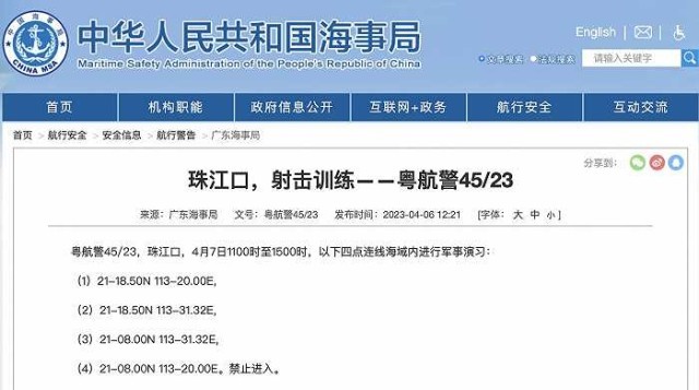 央視網(wǎng)消息:據(jù)中國(guó)海事局網(wǎng)站消息,廣東海事局發(fā)布航行警告,4月7日11時(shí)至15時(shí),珠江口部分海域內(nèi)將進(jìn)行軍事演習(xí),禁止進(jìn)入。