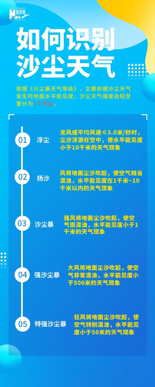 沙塵天氣是指風(fēng)將地面塵土、沙粒卷入空中,使空氣混濁的天氣現(xiàn)象。根據(jù)《沙塵暴天氣等級》,主要依據(jù)沙塵天氣發(fā)生時地面水平能見度,沙塵天氣強(qiáng)度由輕至重分為5個等級。