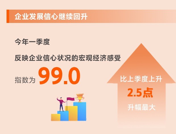 今年以來(lái),我國(guó)經(jīng)濟(jì)運(yùn)行持續(xù)回暖,增長(zhǎng)動(dòng)能不斷釋放,發(fā)展信心明顯增強(qiáng)。一季度,反映企業(yè)信心狀況的宏觀經(jīng)濟(jì)感受指數(shù)為99.0,比上季度上升2.5點(diǎn),升幅最大。從宏觀經(jīng)濟(jì)感受指數(shù)的細(xì)項(xiàng)看,宏觀感受指數(shù)為103.6,比上季度上升2.4點(diǎn),高于景氣臨界值100;行業(yè)運(yùn)行指數(shù)為94.3,比上季度上升2.6點(diǎn),升幅較大。