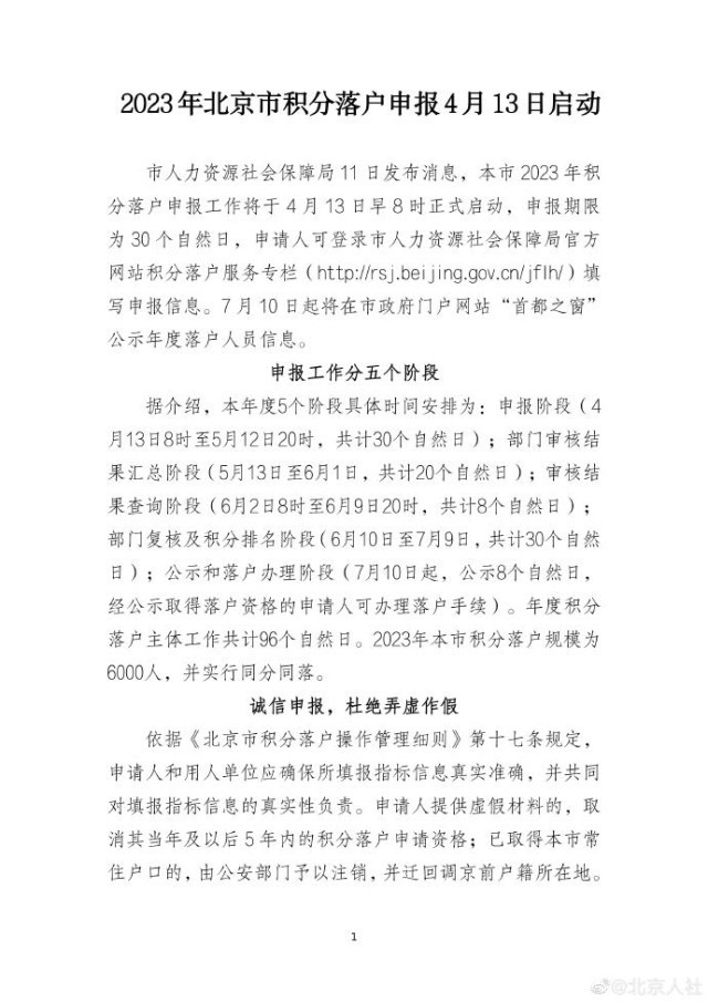 央視網(wǎng)消息:據(jù)@北京人社 微博消息,2023年北京市積分落戶申報工作將于4月13日早8時正式啟動。