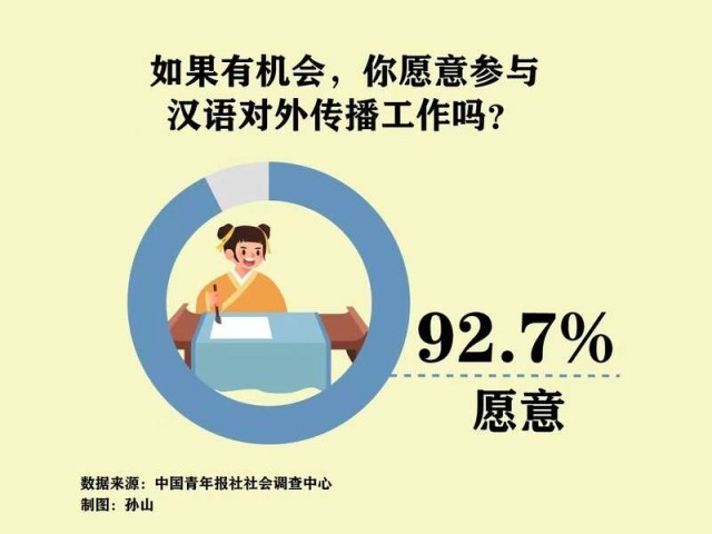 在4月20日聯(lián)合國中文日到來之際,中國青年報社社會調(diào)查中心聯(lián)合問卷網(wǎng)(wenjuan.com),對2002名受訪青年進行的一項調(diào)查顯示,81.6%的受訪青年認(rèn)為漢語熱下,對外漢語工作者的需求量會增加。92.7%的受訪青年明確表示如果有機會,愿意參與漢語對外傳播工作。
