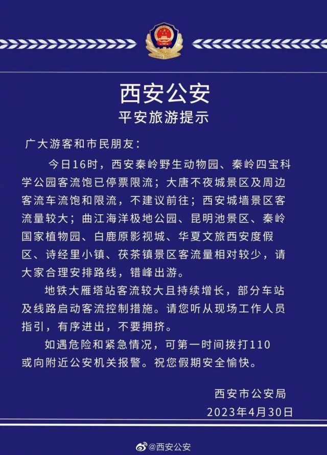 4月30日,西安多個(gè)景區(qū)停票限流。西安公安果斷發(fā)布旅游提示,不建議游客前往大唐不夜城,提示游客合理安排路線(xiàn),錯(cuò)峰出游。