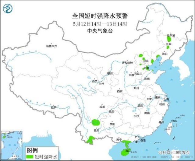 預(yù)計5月12日14時至13日14時,河北中部和東北部、北京西北部和南部、天津南部、吉林中西部、遼寧西北部、山東北部等地的部分地區(qū)將有8-10級雷暴大風(fēng)或冰雹天氣;吉林中部、遼寧西部、河北中北部、北京西北部、天津南部、山東北部、四川南部、云南南部、廣西東南部、廣東西南部、海南島等地的部分地區(qū)將有短時強降水天氣,小時雨量20-40毫米,局地可達50毫米以上。