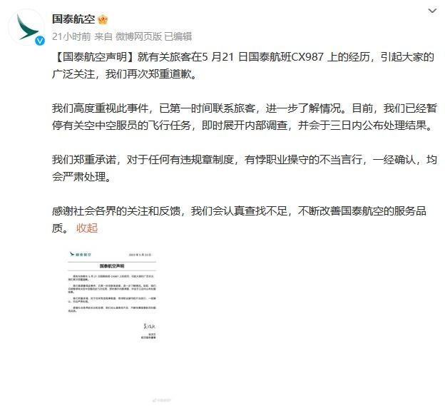 23日,國泰再次發(fā)聲明稱,已第一時(shí)間聯(lián)系旅客,目前已經(jīng)暫停有關(guān)乘務(wù)員的飛行任務(wù),即時(shí)展開內(nèi)部調(diào)查,并會(huì)于三日內(nèi)公布處理結(jié)果。