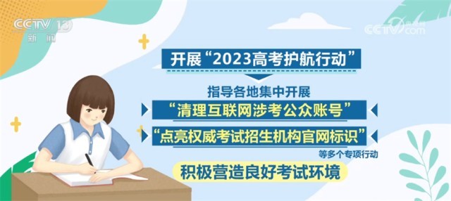 此外,將繼續(xù)開展“2023高考護航行動”,指導各地集中開展“清理互聯網涉考公眾賬號”“點亮權威考試招生機構官網標識”等多個專項行動,積極營造良好考試環(huán)境。