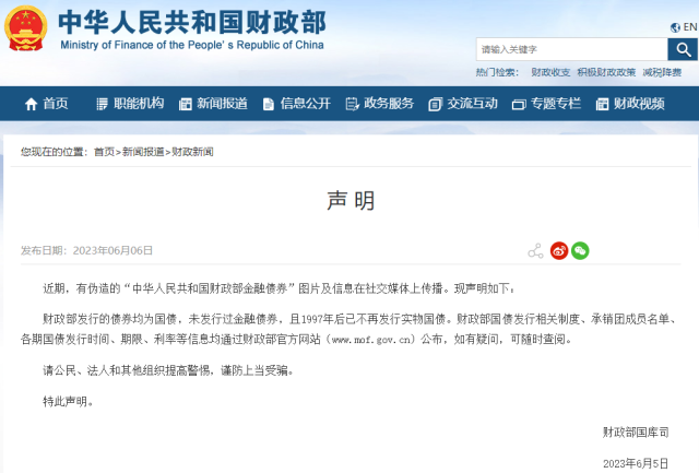 央視網(wǎng)消息:6月6日,財(cái)政部網(wǎng)站發(fā)布聲明,近期,有偽造的“中華人民共和國財(cái)政部金融債券”圖片及信息在社交媒體上傳播?,F(xiàn)聲明如下: