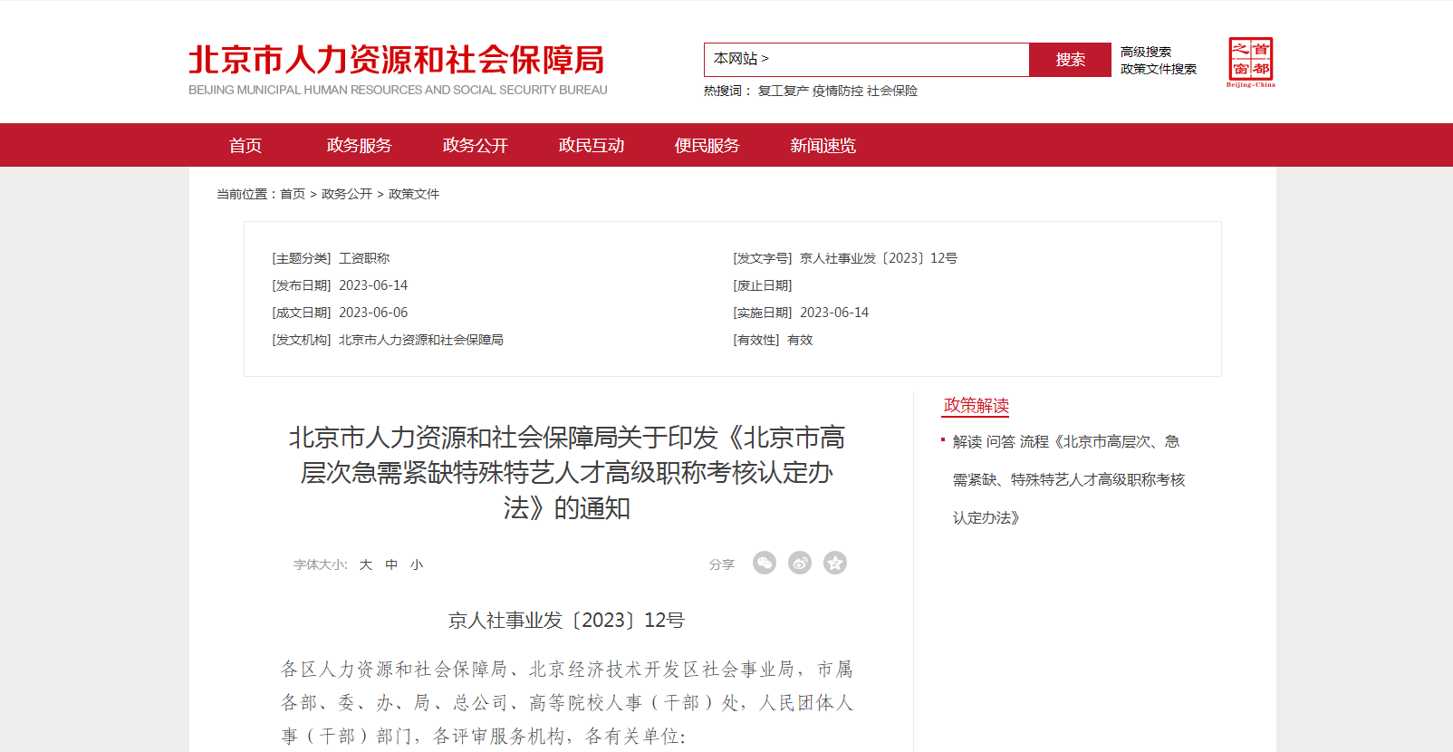 結(jié)合《關于進一步加強和改進職稱工作的通知》,北京還配套出臺了《北京市高層次、急需緊缺、特殊特藝人才高級職稱考核認定辦法》,作為北京現(xiàn)行職稱評價體系的有益補充。對取得重大基礎研究和前沿技術突破、解決重大工程技術難題或在經(jīng)濟社會各項事業(yè)中作出重大貢獻的專業(yè)技術人才,以及引進的高層次、急需緊缺、特殊特藝人才,可以采取“一事一議”“一人一策”的方式直接申報高級職稱,不拘一格“評”人才。