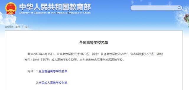 央視網(wǎng)消息:據(jù)教育部,截至2023年6月15日,全國高等學(xué)校共計(jì)3072所,其中:普通高等學(xué)校2820所,含本科院校1275所、高職(專科)院校1545所;成人高等學(xué)校252所。本名單未包含港澳臺(tái)地區(qū)高等學(xué)校。