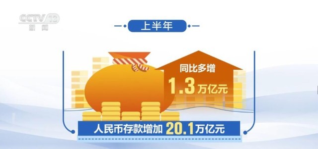 此外,數(shù)據(jù)顯示,上半年人民幣存款增加20.1萬億元,同比多增1.3萬億元。