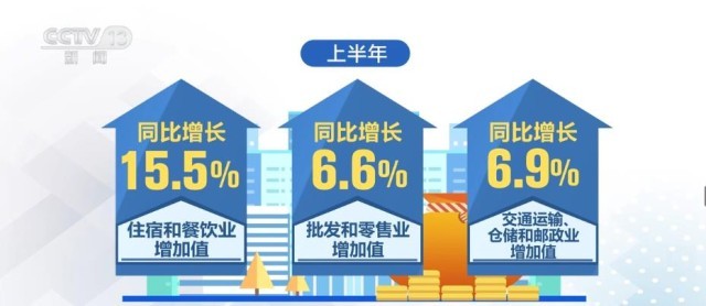 2023年上半年,我國(guó)服務(wù)業(yè)增加值同比增長(zhǎng)6.4%,接觸型服務(wù)業(yè)較快增長(zhǎng)。上半年,住宿和餐飲業(yè)、批發(fā)和零售業(yè)、交通運(yùn)輸、倉(cāng)儲(chǔ)和郵政業(yè)增加值同比分別增長(zhǎng)15.5%、6.6%和6.9%。