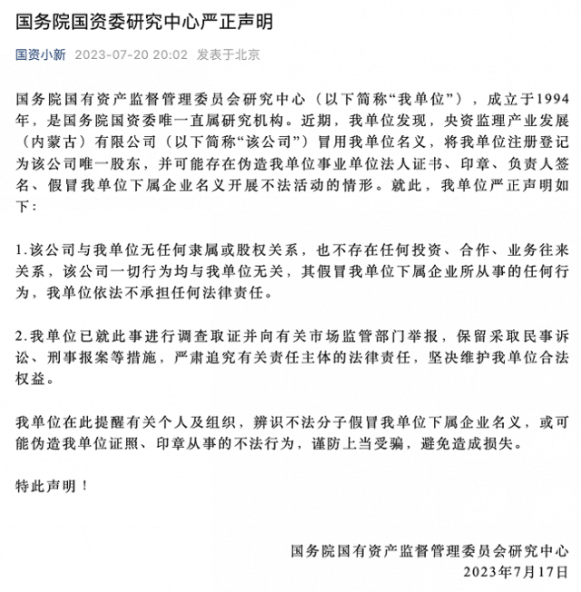 國務(wù)院國資委研究中心:一公司冒用我單位名義或開展不法活動(dòng),已調(diào)查取證并舉報(bào)
