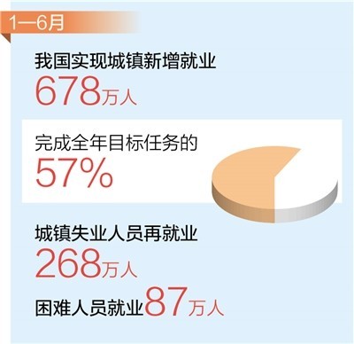 前6月,我國實(shí)現(xiàn)城鎮(zhèn)新增就業(yè)678萬人,完成全年目標(biāo)任務(wù)的57% 就業(yè)形勢(shì)保持總體穩(wěn)定