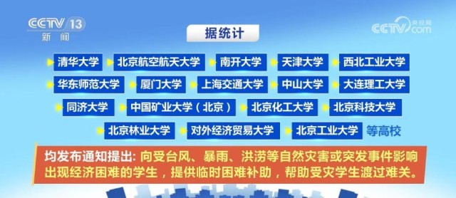據(jù)統(tǒng)計(jì),清華大學(xué)、北京航空航天大學(xué)、南開(kāi)大學(xué)、天津大學(xué)、西北工業(yè)大學(xué)、華東師范大學(xué)、廈門大學(xué)、上海交通大學(xué)、中山大學(xué)、大連理工大學(xué)、同濟(jì)大學(xué)、中國(guó)礦業(yè)大學(xué)(北京)、北京化工大學(xué)、北京科技大學(xué)、北京林業(yè)大學(xué)、對(duì)外經(jīng)濟(jì)貿(mào)易大學(xué)、北京工業(yè)大學(xué)等高校均發(fā)布通知提出,向受臺(tái)風(fēng)、暴雨、洪澇等自然災(zāi)害或突發(fā)事件影響出現(xiàn)經(jīng)濟(jì)困難的學(xué)生,提供臨時(shí)困難補(bǔ)助,幫助受災(zāi)學(xué)生渡過(guò)難關(guān)。