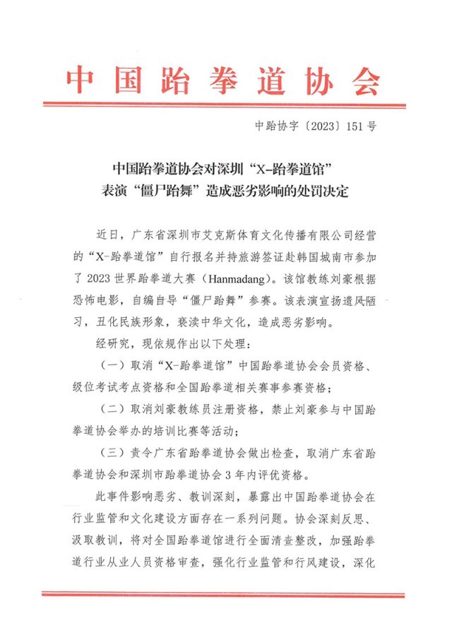 央視網消息:8月21日,中國跆拳道協(xié)會官網發(fā)布對深圳“X-跆拳道館”表演“僵尸跆舞”造成惡劣影響的處罰決定。