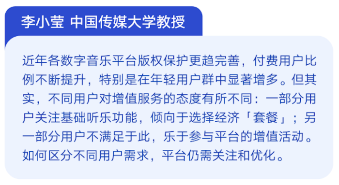 “近年各數(shù)字音樂平臺(tái)版權(quán)保護(hù)更趨完善,付費(fèi)用戶比例不斷提升,特別是在年輕用戶群中顯著增多”,中國傳媒大學(xué)教授李小瑩指出,不同用戶對增值服務(wù)的態(tài)度有所不同:一部分用戶關(guān)注基礎(chǔ)聽樂功能,傾向于選擇經(jīng)濟(jì)“套餐”;另一部分用戶不滿足于此,樂于參與平臺(tái)的增值活動(dòng)。