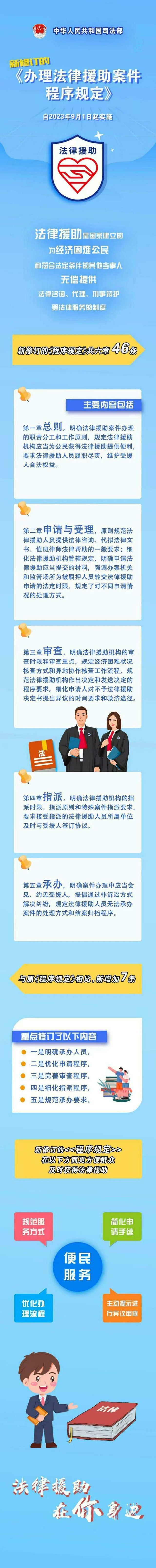 為貫徹落實(shí)法律援助法,提高法律援助案件辦理程序的標(biāo)準(zhǔn)化規(guī)范化水平,司法部對(duì)2012年公布并施行的《辦理法律援助案件程序規(guī)定》進(jìn)行了全面修訂,修訂后的《程序規(guī)定》,在方便群眾及時(shí)獲得法律援助、提高法律援助服務(wù)質(zhì)量等方面,作出了一系列具體規(guī)定。《程序規(guī)定》自2023年9月1日起施行。