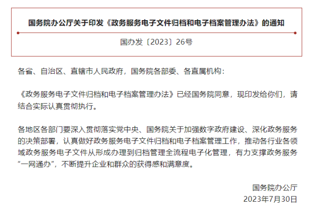 《辦法》就進一步規(guī)范政務服務電子文件歸檔和電子檔案管理,推動各行業(yè)各領(lǐng)域政務服務電子文件從形成辦理到歸檔管理全流程電子化,在機制和流程上提出明確要求,將有力支撐政務服務“一網(wǎng)通辦”。