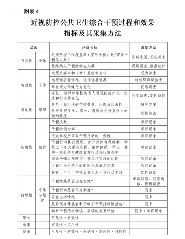 2.注重過程與效果評(píng)價(jià)。各級(jí)疾控機(jī)構(gòu)要定期開展學(xué)生視力監(jiān)測(cè)工作,深入分析歷年監(jiān)測(cè)數(shù)據(jù),將監(jiān)測(cè)發(fā)現(xiàn)的主要學(xué)生健康問題和建議及時(shí)報(bào)告當(dāng)?shù)卣;趯?shí)施性研究方法,從理論向?qū)嵺`進(jìn)行轉(zhuǎn)化和應(yīng)用,可推進(jìn)干預(yù)行動(dòng)的實(shí)施與傳播。進(jìn)行過程與效果評(píng)價(jià),引入實(shí)施性研究框架和理論模型,如近視防控公共衛(wèi)生綜合干預(yù)過程和效果指標(biāo)及其采集方法(附表4),從個(gè)體層面和組織層面全面評(píng)價(jià)干預(yù)行動(dòng)的可及性、有效性、應(yīng)用性、可持續(xù)性,系統(tǒng)性地評(píng)估兒童青少年近視公共衛(wèi)生綜合干預(yù)的實(shí)施成效。