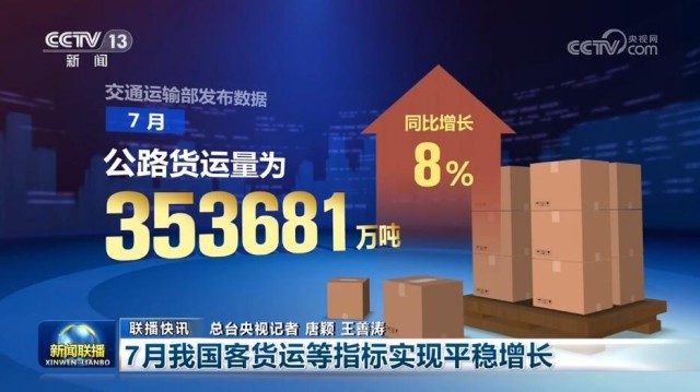 353681萬噸。交通運輸部發(fā)布數(shù)據(jù),7月,公路貨運量為353681萬噸,同比增長8%;水路貨運量為78964萬噸,同比增長6.9%??瓦\方面,7月公路客運量為40798萬人,同比增長19.3%;水路客運量為3034萬人,同比增長78.3%。