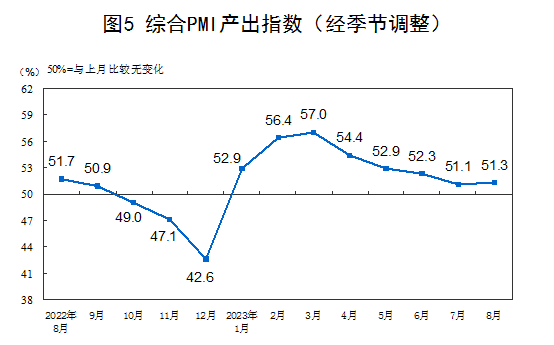 8月份,綜合PMI產(chǎn)出指數(shù)為51.3%,比上月上升0.2個(gè)百分點(diǎn),繼續(xù)保持在擴(kuò)張區(qū)間,表明我國(guó)企業(yè)生產(chǎn)經(jīng)營(yíng)活動(dòng)總體穩(wěn)定擴(kuò)張。