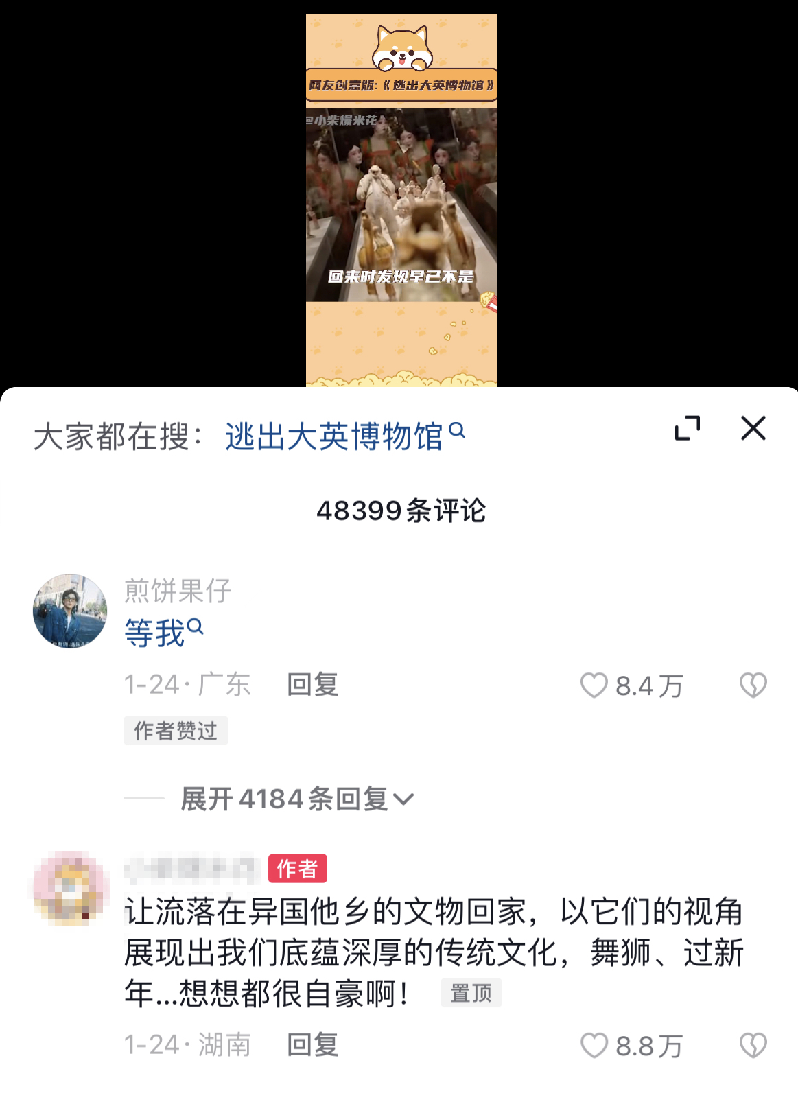 《逃出大英博物館》由兩位90后自媒體人“煎餅果仔”和“夏天妹妹噢”共同創(chuàng)作。短片上線前期,正逢大英博物館被多個(gè)國(guó)家要求歸還本國(guó)文物,戳中了每一個(gè)中國(guó)人強(qiáng)烈期盼流失海外文物早日回家的內(nèi)心。