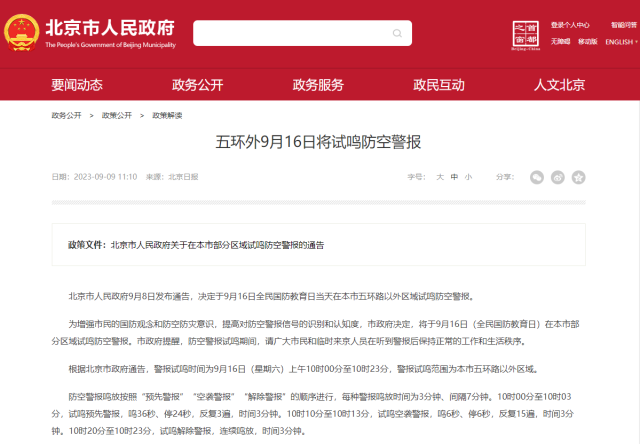 北京市人民政府9月8日發(fā)布通告,決定于9月16日全民國防教育日當(dāng)天在本市五環(huán)路以外區(qū)域試鳴防空警報。