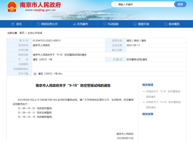 據(jù)南京市人民政府通告,9月18日上午10時至10時19分南京全市防空警報試鳴。