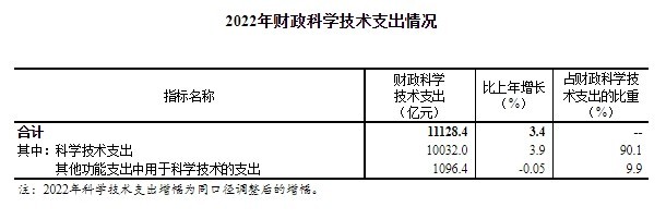 2022年,國(guó)家財(cái)政科學(xué)技術(shù)支出11128.4億元,比上年增加361.7億元,增長(zhǎng)3.4%。其中,中央財(cái)政科技支出3803.4億元,占全國(guó)財(cái)政科技支出的比重為34.2%;地方財(cái)政科技支出7325.0億元,占比為65.8%。