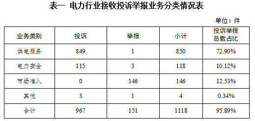 電力行業(yè)排在首位,數(shù)量為1118件、占投訴舉報總數(shù)的95.89%,主要集中在供電服務(wù)、市場準入、電力安全等方面。