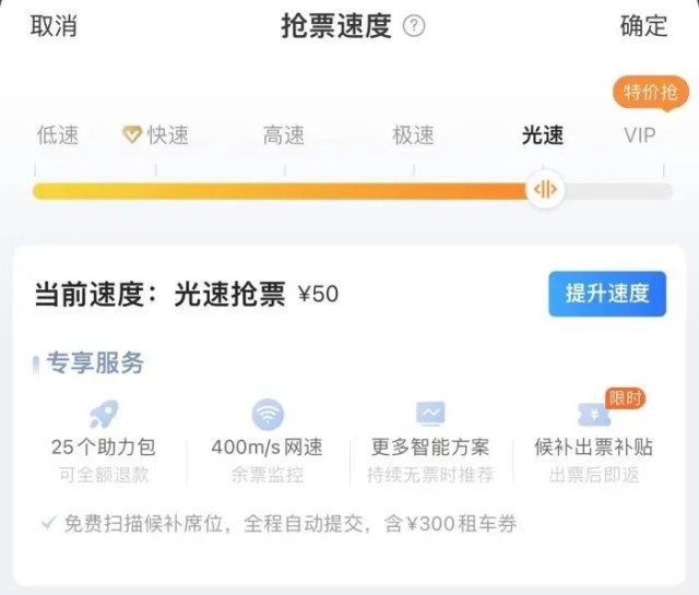 此外,許多第三方平臺推出搶票加速服務。例如,某平臺實行階梯服務及價位,速度從快速、高速、極速、光速到VIP,分別提供5-40個“助力包”,網速為200-500m/s,價格從10-80元不等,平臺會贈送助力包,也可通過邀請好友獲取。該平臺還推出專人搶票功能,使用該功能可以24小時不間斷、通過更多渠道搶票,提高搶票成功率,價格為30元。此外,搶靠窗、過道的位置需另外加價。