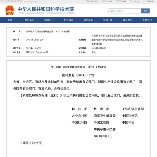 中國青年報(bào)客戶端北京10月8日電(中青報(bào)·中青網(wǎng)記者 張茜)記者今天從科技部網(wǎng)站獲悉,科技部、教育部、工業(yè)和信息化部等10部門聯(lián)合發(fā)布《科技倫理審查辦法(試行)》,對科技倫理審查主體、審查程序、監(jiān)督管理等內(nèi)容作出明確規(guī)定。