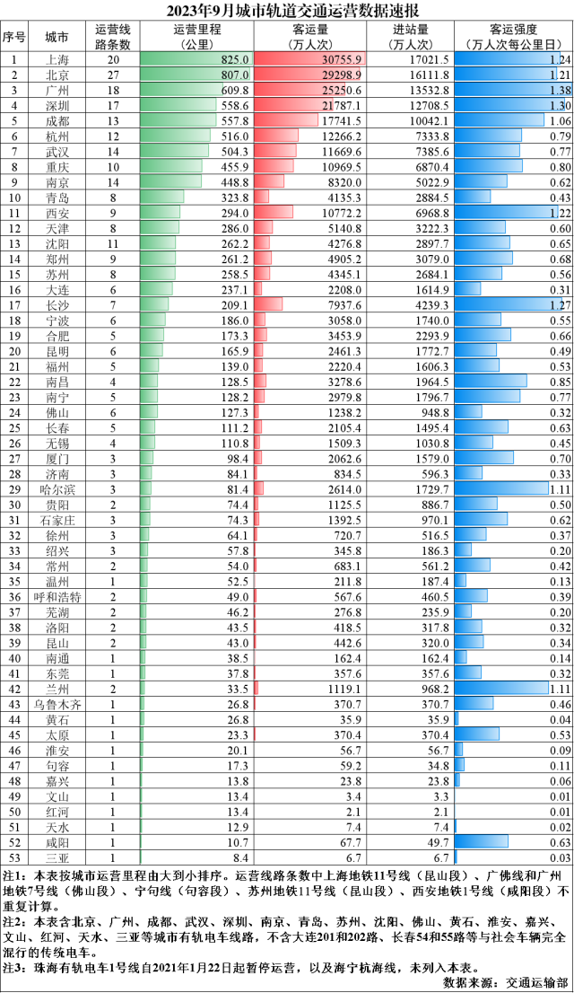 2023年9月,31個(gè)省(自治區(qū)、直轄市)和新疆生產(chǎn)建設(shè)兵團(tuán)共有55個(gè)城市開(kāi)通運(yùn)營(yíng)城市軌道交通線路299條,運(yùn)營(yíng)里程9859.5公里,實(shí)際開(kāi)行列車318萬(wàn)列次,完成客運(yùn)量24.9億人次,進(jìn)站量14.9億人次。9月份,客運(yùn)量環(huán)比減少2.2億人次、降低8.2%,同比增加7.1億人次、增長(zhǎng)40%,較2019年月均客運(yùn)量增加5億人次、增長(zhǎng)24.9%。9月份客運(yùn)強(qiáng)度平均水平為0.536萬(wàn)人次每公里日,較2019年全年客運(yùn)強(qiáng)度平均水平降低1.8%。