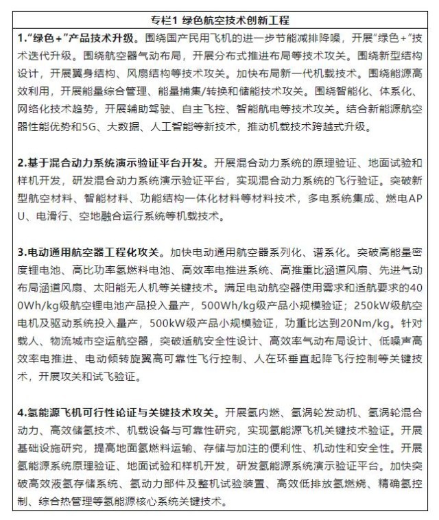 1.強化綠色航空關(guān)鍵核心技術(shù)攻關(guān)。持續(xù)推動總體、氣動、結(jié)構(gòu)、發(fā)動機、機載、材料、制造工藝等領(lǐng)域技術(shù)升級換代,加速發(fā)展混合動力推進系統(tǒng),不斷提升干支線飛機、通用航空器節(jié)能減排降噪水平。加快發(fā)展高能量密度、高放電效率、高安全性的航空動力電池技術(shù),以及高可靠性、高功重比、高效率的航空電推進技術(shù)。加強高效燃氣渦輪-電能融合技術(shù)研究。引導優(yōu)勢企業(yè)和研究機構(gòu)持續(xù)突破智能化、高可靠性、輕量化、低成本能量控制和飛行控制技術(shù),開展新能源飛機總體設(shè)計、能源系統(tǒng)設(shè)計、全電機載系統(tǒng)等技術(shù)攻關(guān)。持續(xù)探索氫燃料存儲技術(shù)、氫燃料電池技術(shù)、氫內(nèi)燃、氫渦輪發(fā)動機技術(shù)、氫渦輪混合電推進技術(shù)、能量綜合管理技術(shù)等氫能源飛機關(guān)鍵技術(shù)。面向國家綠色航空發(fā)展的戰(zhàn)略需要,加快布局基礎(chǔ)研究和應用基礎(chǔ)研究,解決制約綠色航空發(fā)展的源頭和底層技術(shù)問題。