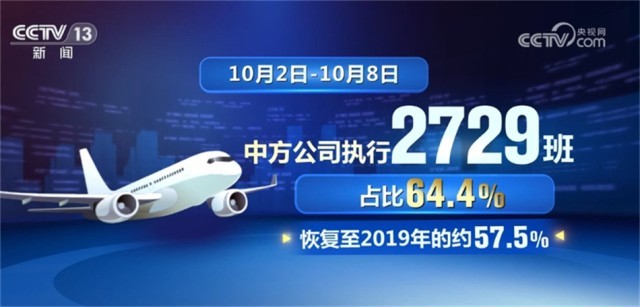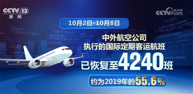 民航局最新數(shù)據(jù)顯示,上周(10月2日—10月8日),中外航空公司執(zhí)行的國際定期客運(yùn)航班已恢復(fù)至4240班,約為2019年的55.6%;其中中方公司執(zhí)行2729班,占比64.4%,恢復(fù)至2019年的約57.5%;外航執(zhí)行1511班,占比35.6%,恢復(fù)至2019年的約42.5%。