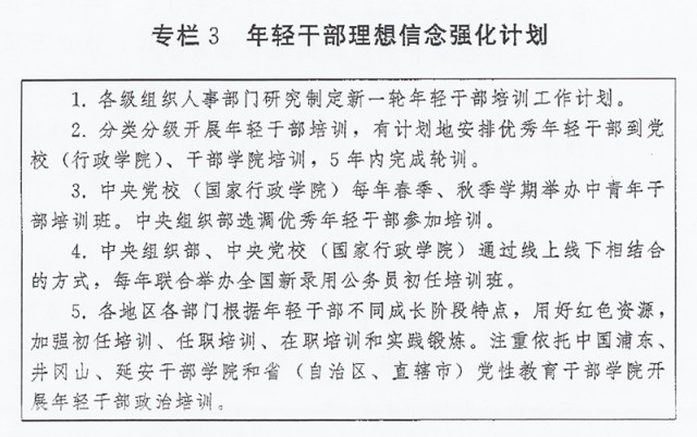 (三)加強(qiáng)年輕干部政治訓(xùn)練。強(qiáng)化習(xí)近平新時(shí)代中國(guó)特色社會(huì)主義思想學(xué)習(xí)教育,突出政治忠誠教育、理想信念教育、紀(jì)律規(guī)矩教育,加強(qiáng)優(yōu)良傳統(tǒng)作風(fēng)和責(zé)任感使命感教育,強(qiáng)化斗爭(zhēng)意識(shí),綜合運(yùn)用理論講授、政策解讀、案例教學(xué)、現(xiàn)場(chǎng)體驗(yàn)等方式開展系統(tǒng)培訓(xùn)。黨委(黨組)負(fù)責(zé)同志要講好“開班第一課”。安排思想政治素質(zhì)過硬、理論水平較高、實(shí)踐經(jīng)驗(yàn)豐富的領(lǐng)導(dǎo)干部上講臺(tái)授課。探索推行“政治輔導(dǎo)員”、“導(dǎo)師幫帶”制度。通過開展黨性分析、實(shí)踐鍛煉、過“政治生日”、重溫入黨誓詞等方式,錘煉黨性修養(yǎng)、提高政治覺悟。實(shí)施年輕干部理想信念強(qiáng)化計(jì)劃(專欄3)。