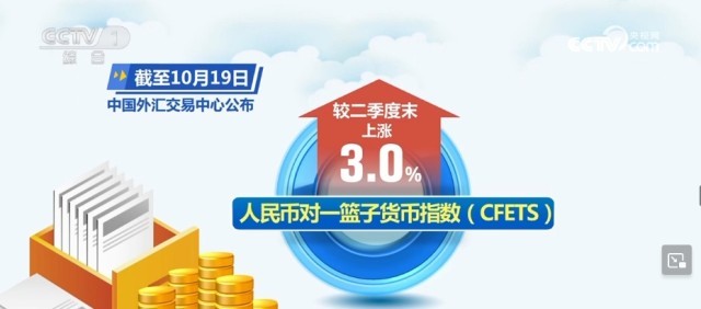 國(guó)家外匯管理局10月20日公布我國(guó)三季度外匯數(shù)據(jù),截至10月19日,中國(guó)外匯交易中心公布的人民幣對(duì)一籃子貨幣指數(shù)(CFETS)較二季度末上漲3.0%。我國(guó)穩(wěn)經(jīng)濟(jì)政策持續(xù)發(fā)力并逐步顯效,人民幣對(duì)美元匯率略有貶值,對(duì)歐元、英鎊、日元等主要貨幣有所升值。人民幣匯率在全球貨幣中表現(xiàn)穩(wěn)健。