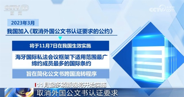 今年3月,我國加入《取消外國公文書認(rèn)證要求的公約》,《公約》將于11月7日在我國生效實施?!豆s》是海牙國際私法會議框架下適用范圍最廣、締約成員最多的國際條約,旨在簡化公文書跨國流轉(zhuǎn)程序。11月7日起,中國送往其他締約國使用的公文書僅需辦理《公約》規(guī)定的附加證明書,即可送其他締約國使用,無需辦理中國和締約國駐華使領(lǐng)館的領(lǐng)事認(rèn)證。其他締約國公文書送中國內(nèi)地使用,只需辦理該國附加證明書,無需辦理該國和中國駐當(dāng)?shù)厥诡I(lǐng)館的領(lǐng)事認(rèn)證。