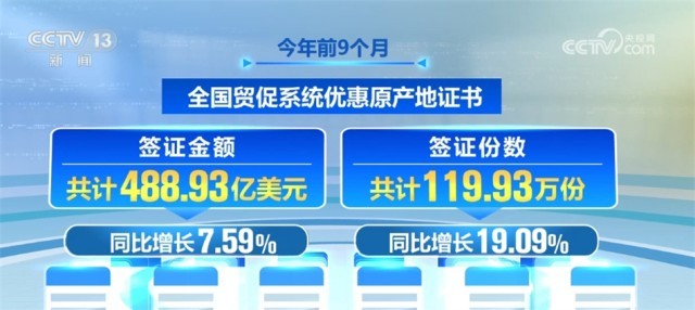 數(shù)據(jù)顯示,今年前9個(gè)月,全國貿(mào)促系統(tǒng)累計(jì)簽發(fā)原產(chǎn)地證書、ATA單證冊(cè)、商事證明書等各類證書455.06萬份,較上年同比增長13.39%。