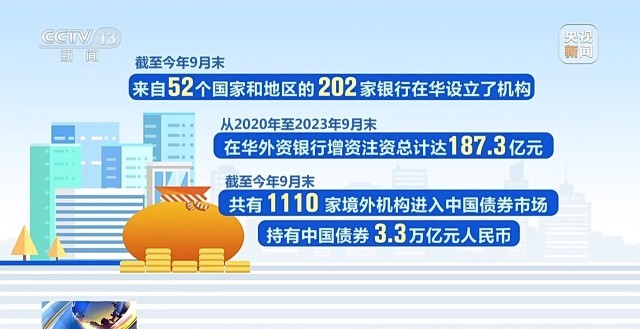 金融開放步伐加快。截至今年9月末,來自52個國家和地區(qū)的202家銀行在華設(shè)立了機(jī)構(gòu);從2020年至2023年9月末,在華外資銀行增資注資總計(jì)達(dá)187.3億元。截至今年9月末,共有1110家境外機(jī)構(gòu)進(jìn)入中國債券市場,持有中國債券3.3萬億元人民幣。