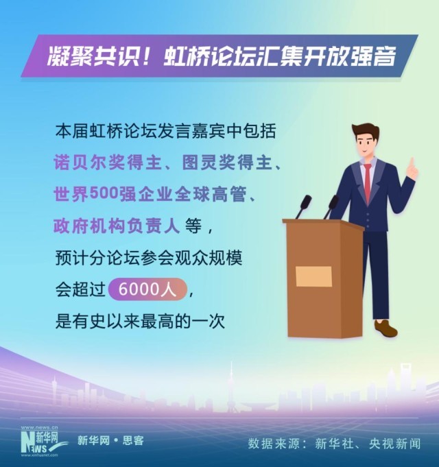 虹橋國際經(jīng)濟論壇是中國國際進(jìn)口博覽會的重要組成部分。隨著進(jìn)博會的“朋友圈”越來越大,虹橋論壇的影響力也不斷提升。今年的論壇以“攜手促發(fā)展,開放贏未來”為主題,發(fā)言嘉賓中包括了諾貝爾獎得主、圖靈獎得主、世界500強企業(yè)全球高管、政府機構(gòu)負(fù)責(zé)人等等,預(yù)計分論壇參會觀眾規(guī)模也會超過6000人,是有史以來最高的一次。