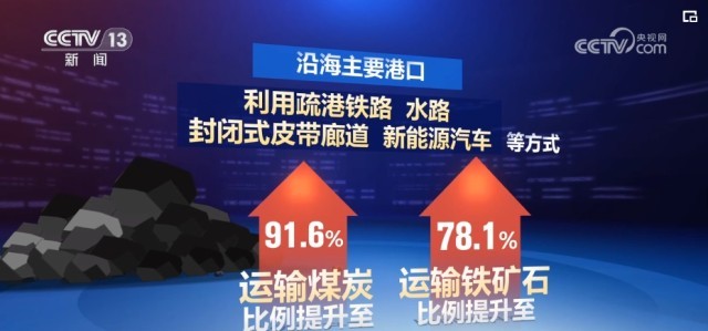 貨物“公轉(zhuǎn)鐵”“公轉(zhuǎn)水”深入推進(jìn),沿海主要港口利用疏港鐵路、水路、封閉式皮帶廊道、新能源汽車等方式運(yùn)輸煤炭、鐵礦石的比例提升至91.6%和78.1%。