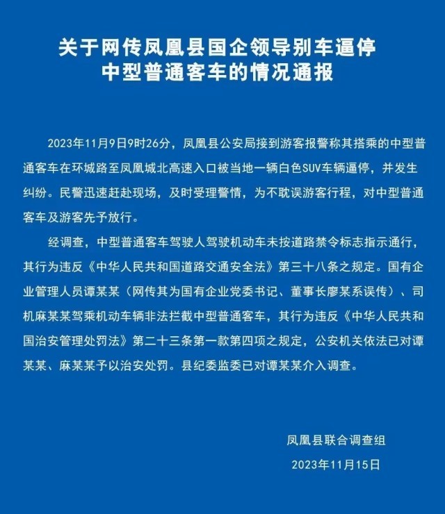 央視網(wǎng)消息:據(jù)鳳凰融媒微信公眾號消息,11月15日,鳳凰縣聯(lián)合調(diào)查組發(fā)布情況通報,經(jīng)調(diào)查,中型普通客車駕駛?cè)笋{駛機動車未按道路禁令標志指示通行,其行為違反相關(guān)規(guī)定。國有企業(yè)管理人員譚某某 (網(wǎng)傳其為國有企業(yè)黨委書記、董事長廖某系誤傳)、司機麻某某駕乘機動車輛非法攔截中型普通客車,其行為違反相關(guān)規(guī)定,公安機關(guān)依法已對譚某某、麻某某予以治安處罰。縣紀委監(jiān)委已對譚某某介入調(diào)查。