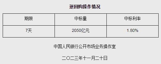 中新網(wǎng)11月20日電 據(jù)央行網(wǎng)站消息,為維護銀行體系流動性合理充裕,2023年11月20日人民銀行以利率招標方式開展了2050億元逆回購操作,中標利率1.80%,期限為7天。具體情況如下: