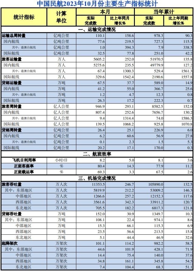 民航局11月20日發(fā)布10月份主要生產(chǎn)指標(biāo)統(tǒng)計(jì)顯示,今年10月,運(yùn)輸總周轉(zhuǎn)量達(dá)到110.1億噸公里,同比增長158.6%;中國民航旅客運(yùn)輸量達(dá)到5605.2萬人,同比增長252%;10月貨郵運(yùn)輸量為67.5萬噸,同比增長37.7%。
