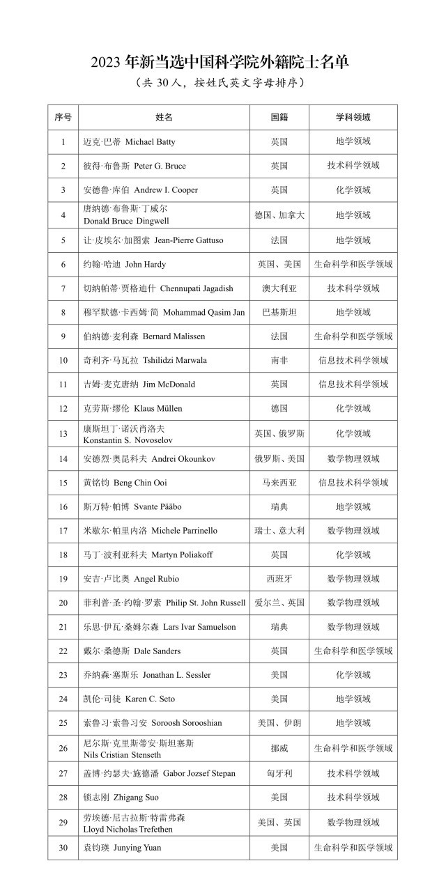 中國科學(xué)院2023年當(dāng)選外籍院士名單。中國科學(xué)院官網(wǎng)圖
