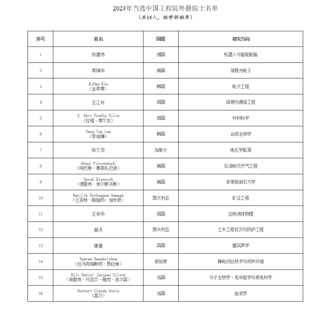 中國工程院2023年當(dāng)選外籍院士名單。中國工程院官網(wǎng)圖