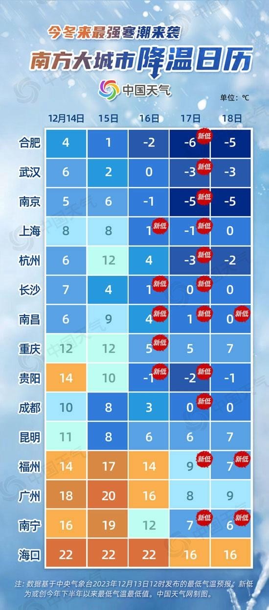 從南方大城市降溫日歷來看,未來五天,合肥、武漢、南京、上海、杭州、貴陽最低氣溫都將逐步下降到冰點以下。南昌16日至18日最低氣溫或連創(chuàng)新低,貴陽最低氣溫將從14℃降至-2℃,降幅可達(dá)16℃。
